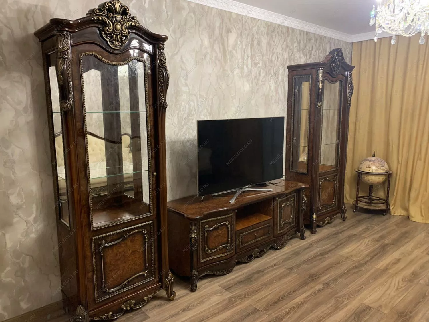 Надежная и безопасная гостиная «Джоконда» укомплектована направляющими и петлями европейского производства для бесшумного и плавного передвижения ящиков и дверей. Она, как природный алмаз, радует изысканными гранями и благородным дизайном. Такая мебель станет беспроигрышным решением для гостиных, оформленных в классическом стиле.