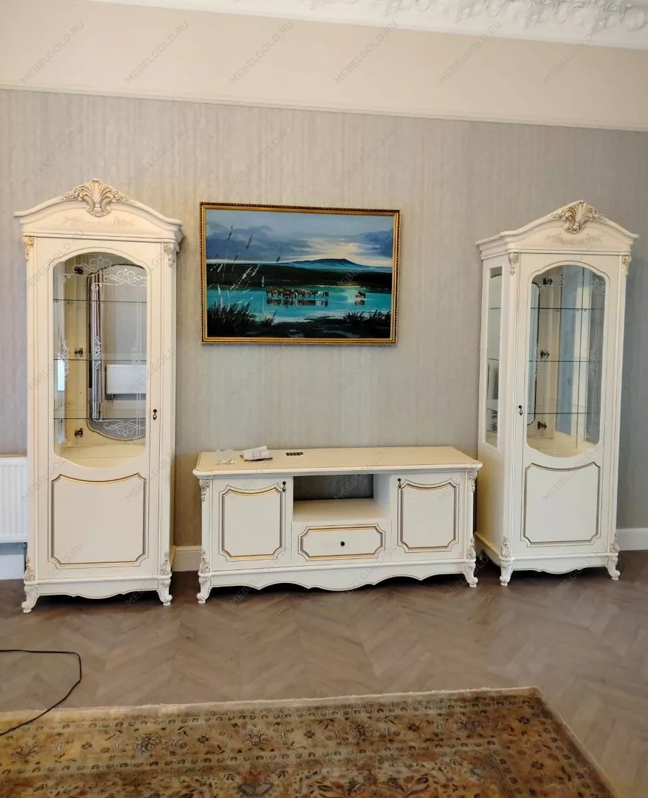 Гостиная «Мона Лиза» ‑ показатель статуса и изысканного вкуса хозяина. Она демонстрирует изысканную роскошь античности и чарующее очарование классического шика. Подчеркнутую привлекательность всему набору придают изогнутые ножки, золоченые орнаменты и кремовые фасады. Комплект состоит двух одинаковых витрин и тумбы под ТВ, ключевых элементов гостевой мебели. Он окрашен в теплый кремовый оттенок и покрыт золотистой патиной. Фрезерованные фасады такой мебели украшают итальянские ручки Salice. Словно пришедшая из античной эпохи, бронзовая фурнитура подчеркивает старинный стиль мебели и придает ей неповторимое очарование.
