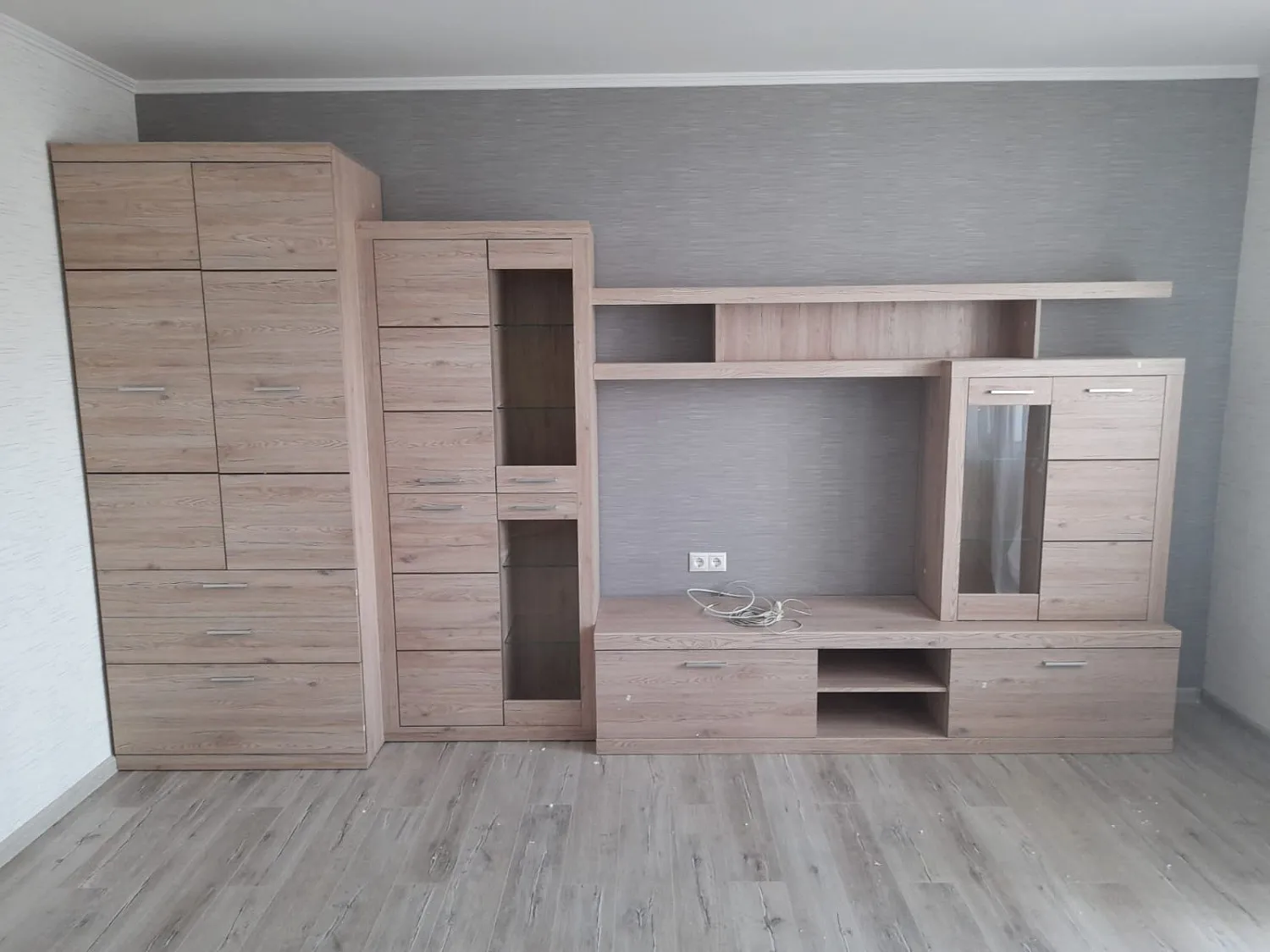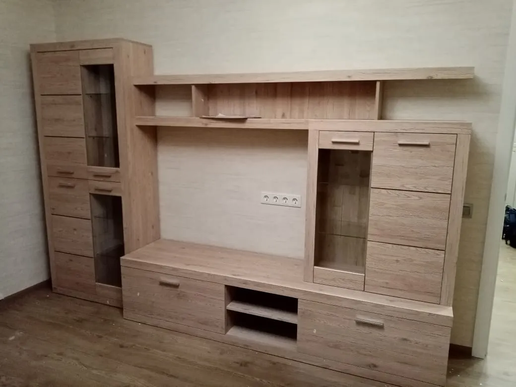 В интерьере гостиная смотрится стильно и современно, не громоздко. Шкафчики и полки глубокие и вместительные, ручки максимально удобные. Рисунок поверхности красивый, не блеклый. Обязательно обратимся в ваш магазин еще и за спальней!