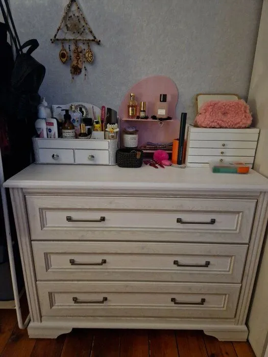 Высота комода составляет 80 см, а ширина ‑ 103 см. Его ящики располагаются горизонтально и полностью выдвигаются из короба. Из них удобно доставать вещи: они всегда будут на виду и даже те, что спрятаны в дальних углах.