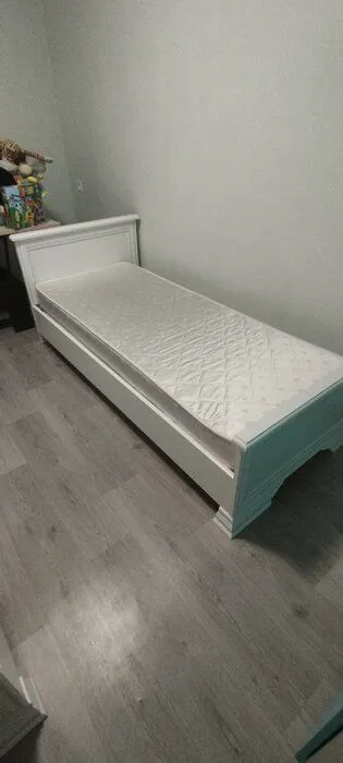 Кровать чисто белого цвета, аккуратная. Собирается легко и удобно, недостающих запчастей не было, даже положили пару лишних пластиковых крепежей, которые, наверное, можно повредить, в расчете на кривые руки. Реечное основание хорошее. Ничего не скрипит. Купила сразу комплект с тумбочками. Доставили вовремя, что с мебелью бывает не всегда.