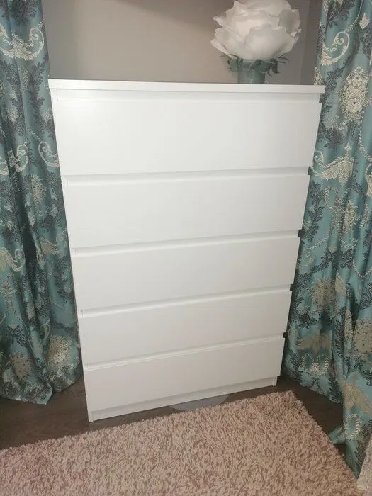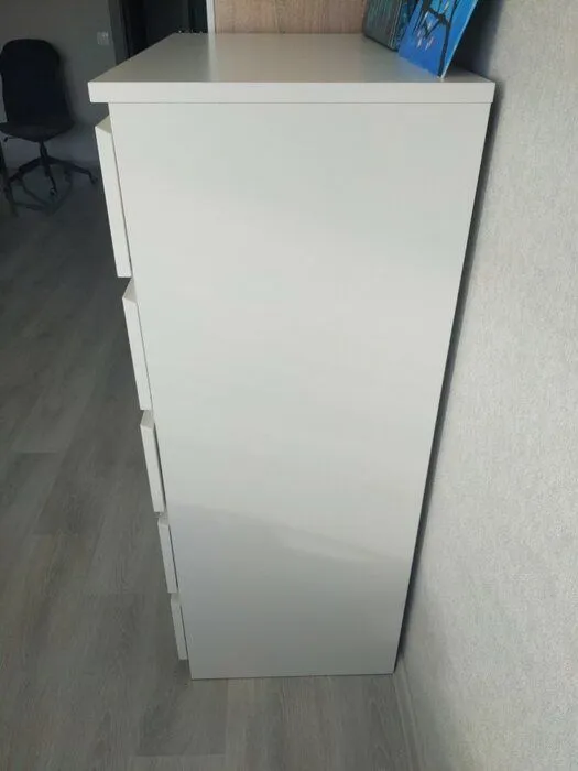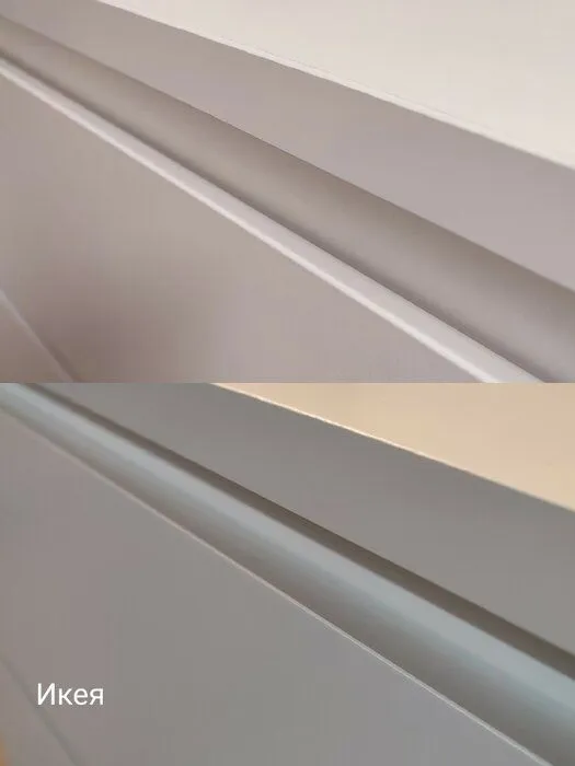Качественное исполнение, отсутствие сколов и брака, все отверстия на своих местах, отсутствие проблем при сборке.. Комод очень похож на оригинальную Икею, в том числе при сборке (на прикреплённом фото рядом с комодом стоит тумба из Икеи). Однако покрытие фасадов всё же отличается: у оригинальной Икеи это покрытие было более твердое и износостойкое, а здесь же более мягкое и тонкое, из-за чего более высок риск образования вмятин и повреждений. В целом же комод достаточно качественно выполнен, все детали ровные, не косят и легко соединяются. Из достоинств также отмечу, что у ящиков шариковые направляющие (в отличие от роликовых у Икеи), в связи с чем ящики выдвигаются на большую длину (30 см против 27 см у Икеи). Как итог, покупкой довольны. P.S. При покупке обращайте внимание на продавца, поскольку часть отзывов на Маркете относится к комоду с совершенно другими характеристиками.