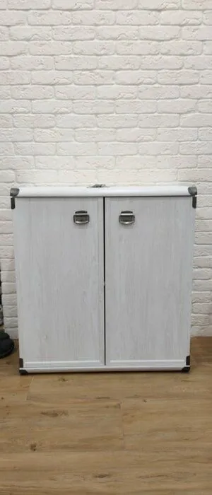 Фасады с древесной текстурой, металлическими накладками на углах и стилизованными ручками из латуни – все это придает тумбочке особый колорит. При закрытых дверцах она имитирует сплошную деревянную стену с прожилками. Светлый оттенок фасадов отлично смотрится на фоне темной и нейтральной отделки.