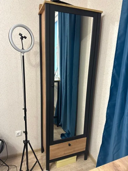 Современный шкаф с зеркалом в стиле Loft – выбор людей, ценящих минимализм и функциональность. Эта узкая и вместительная конструкция высотой 192 и шириной 62 см уместится в самое маленькое пространство и создаст компактную зону для хранения разного типа вещей. Внутри установлено 3 отделения, есть стационарная и переставная штанга для одежды и выдвижной ящик на шариковых направляющих.