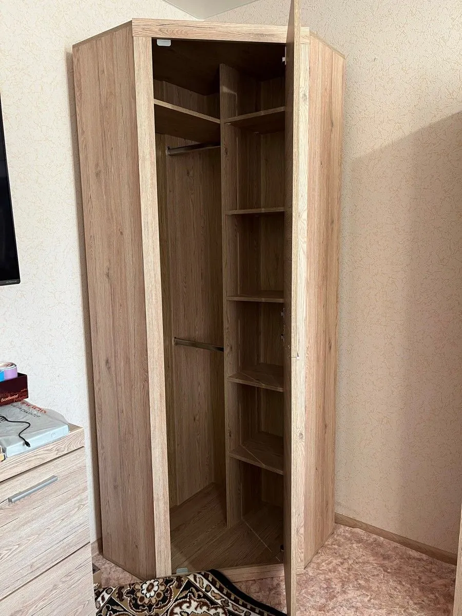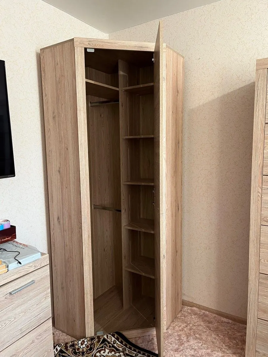 Угловой шкаф с полками Oskar L- P привлекает вместительностью и гармоничной подборкой внутренних элементов. При ширине 77 см и аналогичной глубине его конструкция содержит одну распашную дверь, 2 металлические штанги и 4 боковые полки. Модель изготовлена на белорусском предприятии Anrex с использованием экологически безопасного материала ЛДСП класса Е1.