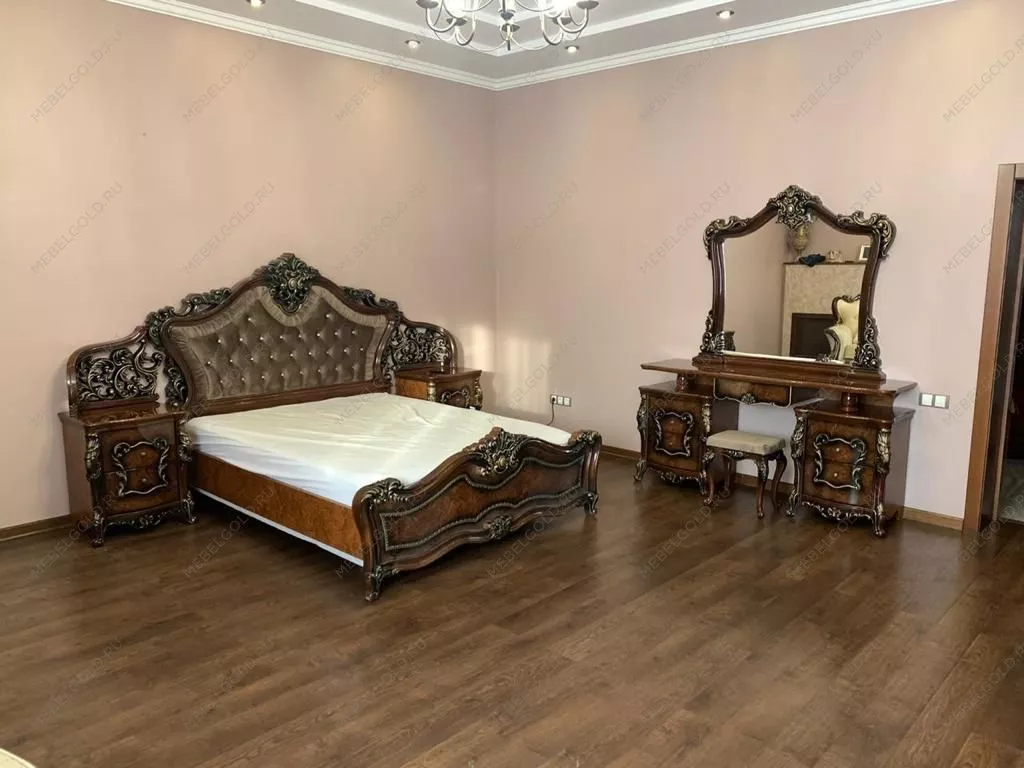 Элегантная спальня «Джоконда» корень дуба глянец 3 оформлена в лучших традициях классического стиля и сочетает шик, функциональность и надежность. В ее комплект входят самые необходимые элементы: 5-створчатый шкаф, двуспальная кровать, прикроватные тумбы, туалетный столик и зеркало. Все предметы строго подобраны по размеру и дизайну и полностью готовы к использованию.