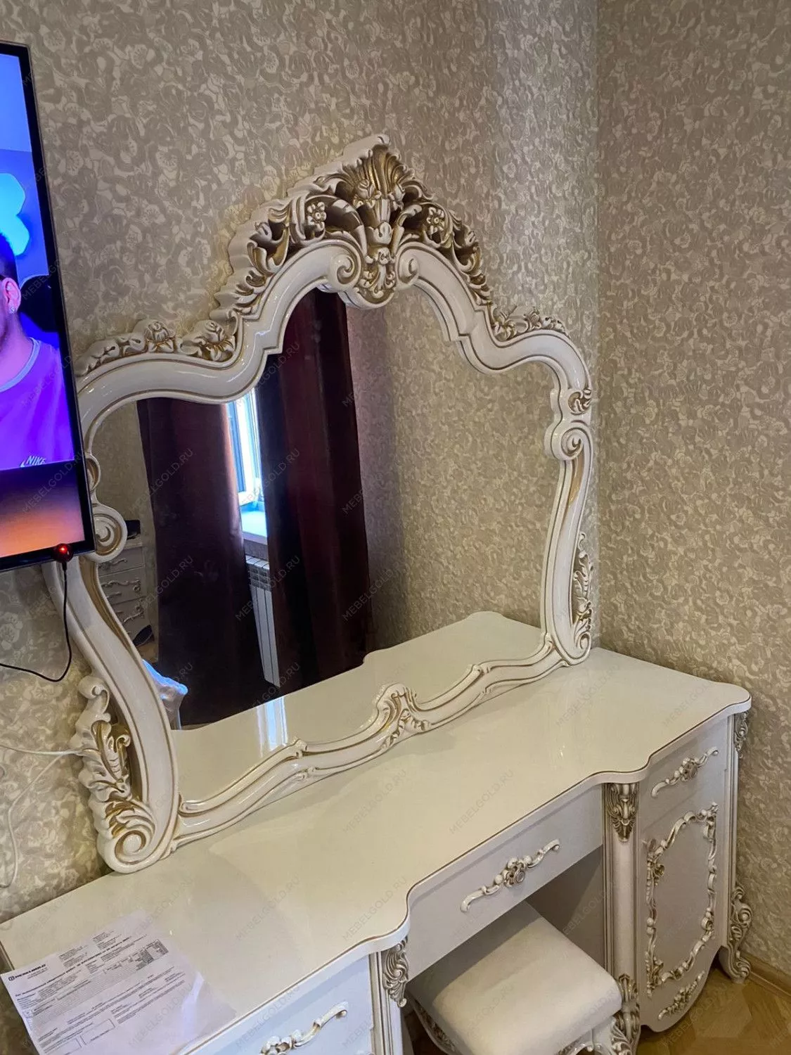 Ящики и дверцы украшены прочной фурнитурой, которая отличается длительным сроком эксплуатации. Фасады мебели украшены изящной резьбой с золотистым покрытием — такой симбиоз выглядит элегантно. Гарнитур изготавливается в Ставрополе, потому его можно заказать с услугой самовывоза или с доставкой в любую точку России.