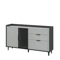 Тумба с тремя выдвижными ящиками; одной глухой распашной дверью и одной распашной витриной из алюминиевой рамки профилем 20х20мм, цвет: чёрный брашированный с тонированным стеклом; две стеклянные полки с тонированным стеклом бесшумными направляющими с доводчиком; петли плавного закрывания