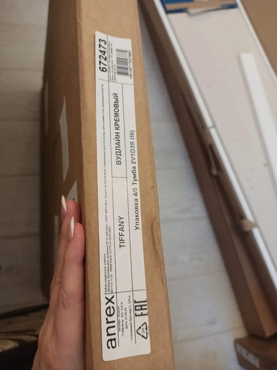 Товар пришёл быстрее чем обещали. Всё хорошо упаковано. Две коробки были немного поцарапанные, зная что внутри есть стекло, я захотела убедиться что оно цело. При мне ребята вскрыли коробки и всё провертли. Стекла целы. Читала в отзывах что нет инструкции, в моих упаковках она есть. Цвет почти Белый. Оттенок больше уходит в розовый нежели в ваниль. При доставке все коробки занесли в квартиру. Позвонили заоанее и предупредили о приезде. Время доставки я указала сама. Есть возможность изменить и день и время. Когда комод будет собран, добавлю ещё одно фото)