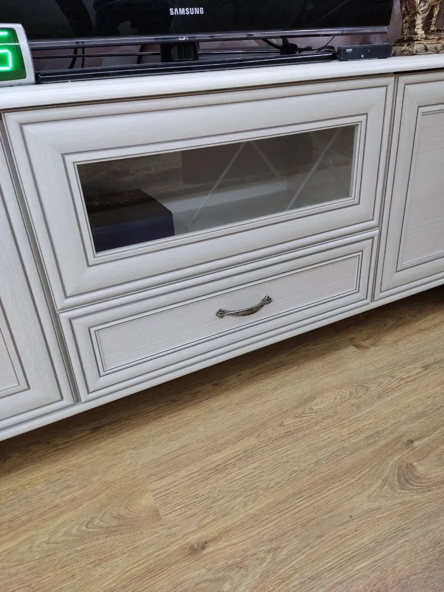 Тумба компактная и вместительная. Мы ее используем не только, как удобную красивую подставку под телевизор. В ней может храниться множество разных небольших предметов, книг, журналов, аксессуаров. Обе дверцы, полочка с откидной дверью и стеклом, выдвижной ящик как будто взяты в деревянные декоративные рамочки. Ручки очень удобные и идеально подходят под такую конструкцию. За каждой дверцей – по две полочки. Тумбочку из магазина забирали самовывозом – сэкономили и не пришлось ожидать доставки))