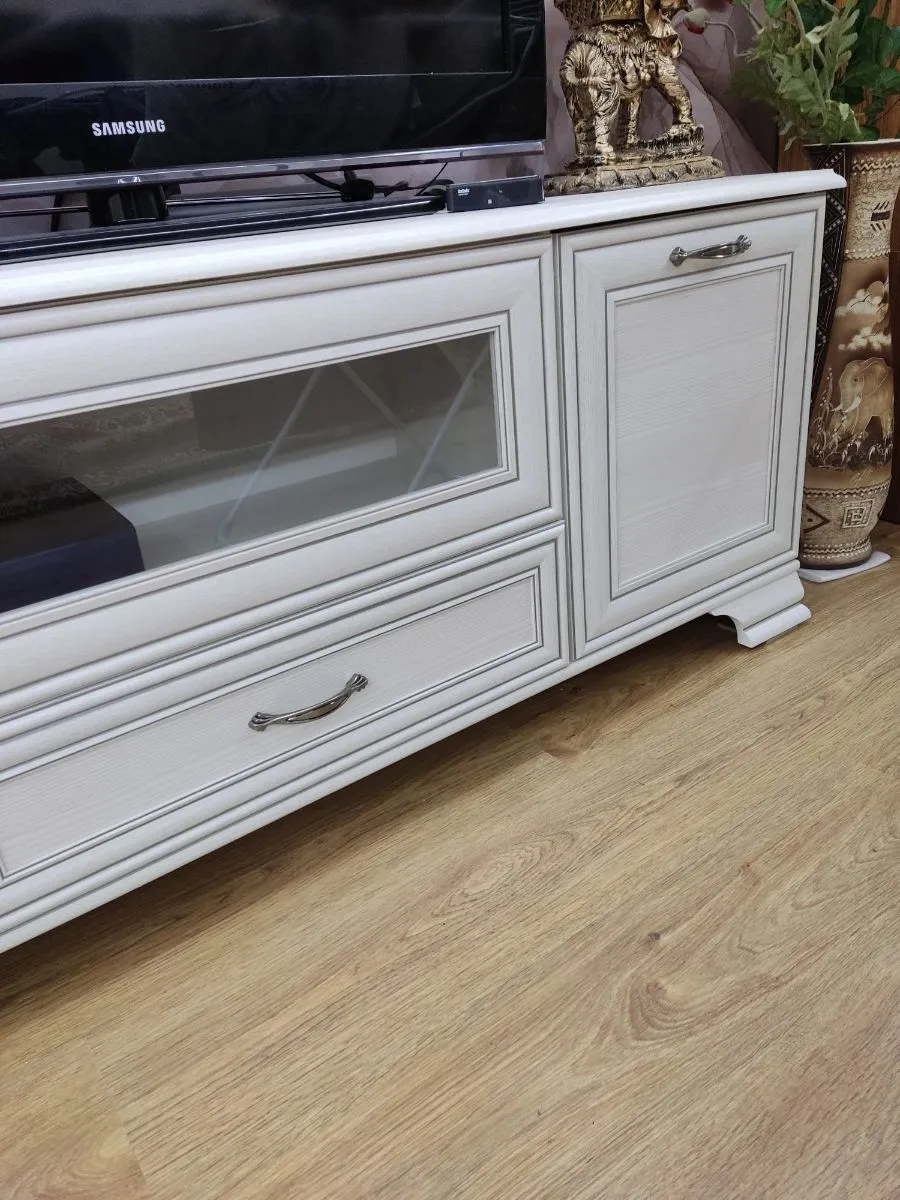 Тумба под ТВ «Тиффани» подходит гостиным классического стиля и прекрасно сочетается с полкой, шкафом и другой мебелью этой коллекции.